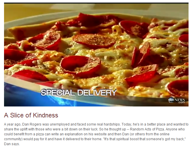 I simply love this. Sometimes it is just nice to do something nice for someone else. Check out the news story about Random Acts of Pizza, and if you want to support Dan Roger’s endeavour and send a pizza to someone who could use a boost, click here to check out his site.