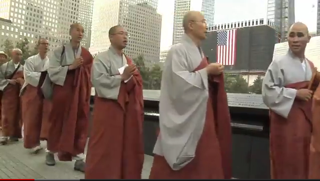 This afternoon, guests touring the newly opened National September 11th Memorial saw an unusual sight — the greatest living master of Korean Seon (Zen), and the 79th Dharma Descendant of the Buddha, leading his monks in a chant of remembrance at Ground Zero. When Seon Master Jinje learned he was going to make an historic visit to NY to speak at the Riverside Church in NYC, he requested to also pay respects to those who perished at Ground Zero. Master Jinje is Enlightened in the tradition of the Buddha and is speaking on Thursday evening, September 15th to an expected audience of 2000 about his 800-year-old form of “questioning meditation” called Ganhwa Seon (Korean Zen). Click here to learn more about this direct descendent of Buddha