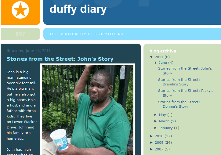 His blog, Duffy Diary, shares the stories of homeless people that he encounters. Ed reminds us that there is humanity in each of us that is valuable and worthy of contemplation. Ed is training for the Chicago marathon, and is in the process of raising $5,000 to help break the cycle of homelessness for women and men in Chicago.
