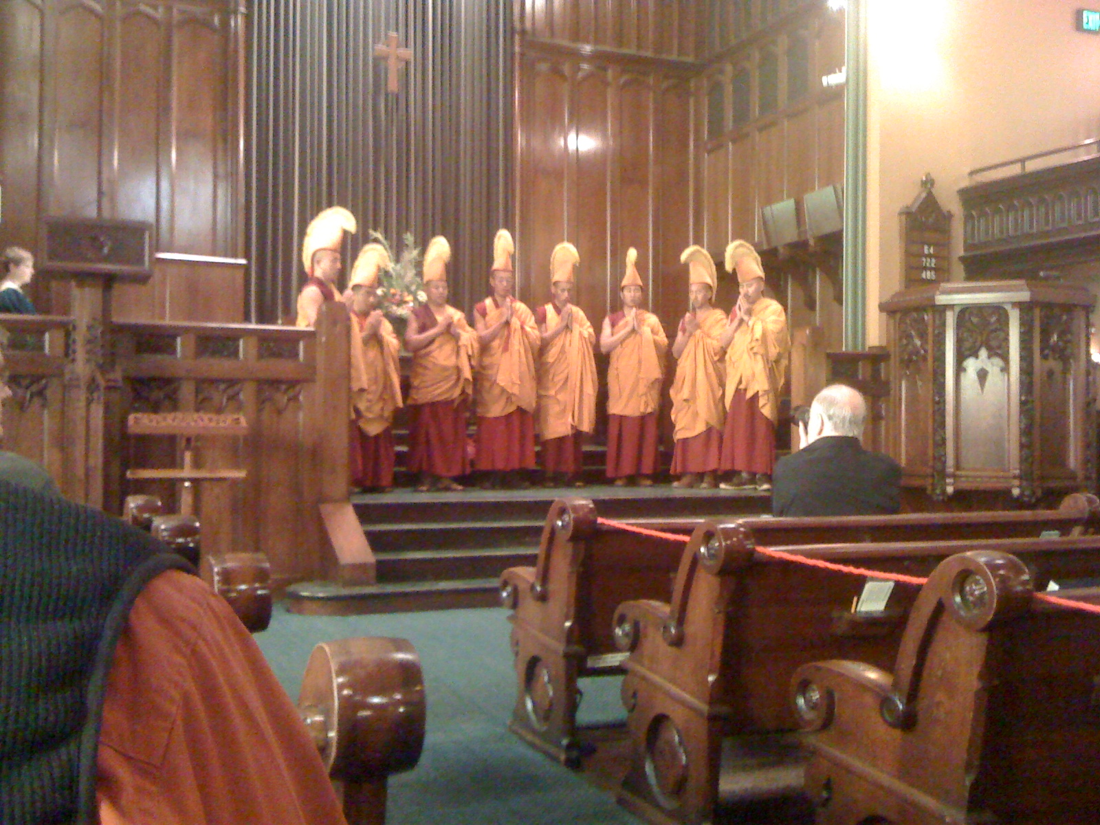 Two of these events will be held at the Lake Street Church of Evanston. The monks will participate in Lake Street Church’s sixteenth annual World Community Sunday celebration, opening the event with temple chants from 10:15 to 10:30 on next Sunday, October 2, 2011 in the Sanctuary. I was blessed to be able to attend this service, and it was fantastic. Here is a picture of the monks chanting before the service: