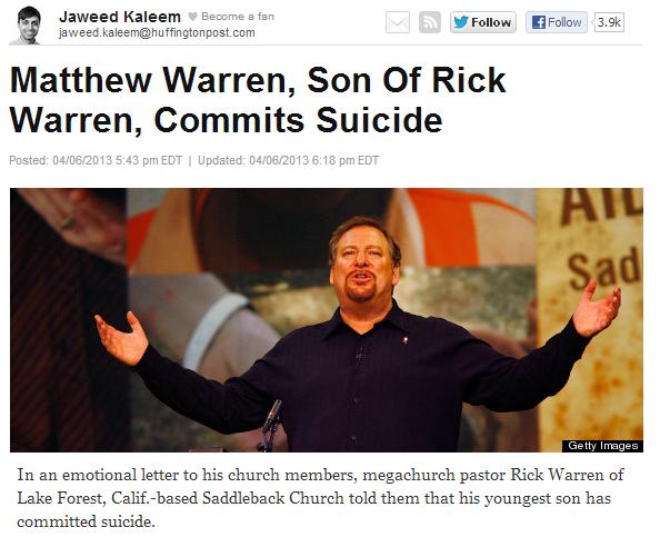 I can’t imagine what Rick Warren and his family are going through right now. So I am sending them prayers. Prayers to their family, and all that love them and the son they just lost.